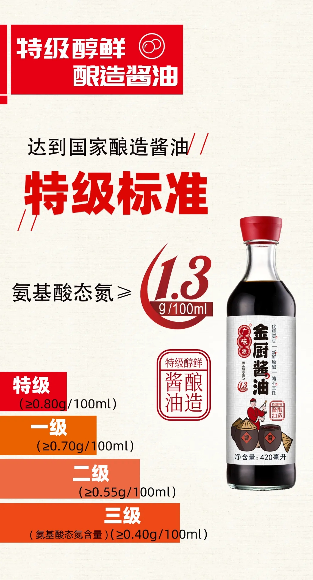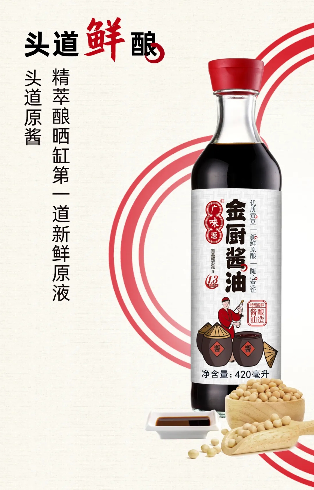 金廚近期推出一款高檔次“觀音瓶”獨(dú)特造型的醬油,它,不僅擁有醬油最原始的新鮮味,也讓我們的生活變得更加時(shí)尚“新鮮”。與其他醬油釀造技術(shù)不同,金廚醬油有著獨(dú)家的調(diào)配配方——“頭道新鮮釀·萃技術(shù)”。也就是說,它從黃豆釀造到頭道萃取,全程采用“新鮮釀·萃”,零添加,純粹無負(fù)擔(dān)。最后,精粹出釀曬缸第一道新鮮原液。這樣萃取出來的頭道原醬,鮮醇而不澀,讓你吃到醬油最自然的醇香!同時(shí),金廚醬油氨基酸態(tài)氮每100ml含量高達(dá)1.3g,營養(yǎng)更豐富。